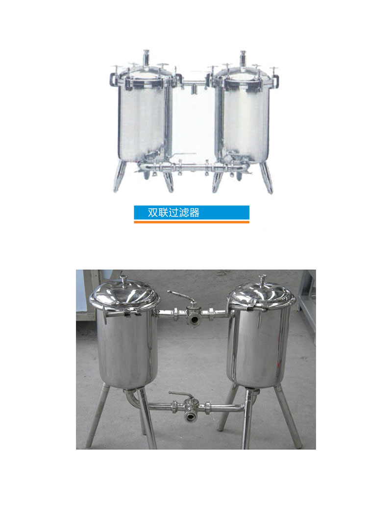 雙聯(lián)式過濾器全部采用SUA304優(yōu)質不銹鋼制造,是二只圓柱體組成,內外表面拋光0.4μm,頂部裝有壓力表、排氣閥,適用于除去鮮奶、糖液、飲料、口服液等液體中各種肉眼看不見的固體雜質的凈化。兩只過濾器交替適用,可在不停機的情況下更換過濾網(wǎng),適于長期連續(xù)生產(chǎn)。